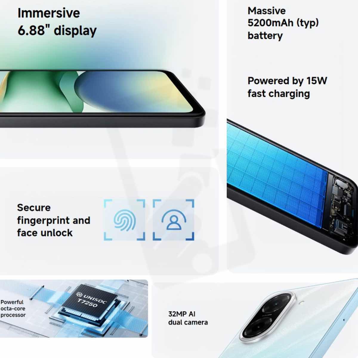 Running on Android 15 (Go edition) with HyperOS, it supports two major Android upgrades. The device is powered by the Unisoc T7250 (12nm) chipset and an octa-core CPU (2×1.8 GHz Cortex-A75 & 6×1.6 GHz Cortex-A55), paired with a Mali-G57 MP1 GPU for smooth performance.